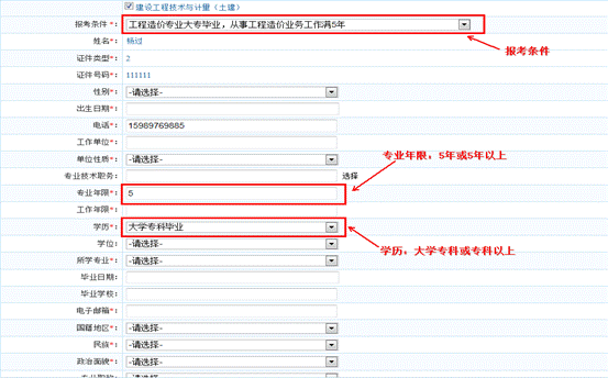 造价考试包括9种报考条件,不同的报考条件报考人员填写的字段内容各不相同。