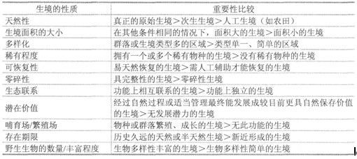建议用表6-2的方法评价某处地方或生境的重要性。虽然表中的方法仅是在定性基础上的比较,但具有较好的普遍性和可操作性。