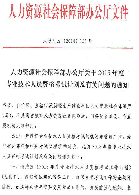 现将人力资源社会保障部办公厅《关于2015年度专业技术人员资格考试计划及有关问题的通知》(人社厅发〔2014〕126号)转发给你们,请积极筹备,认真组织实施。