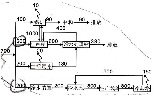 工艺水回用量为400+600=1000,工艺水取水量为200+200=400